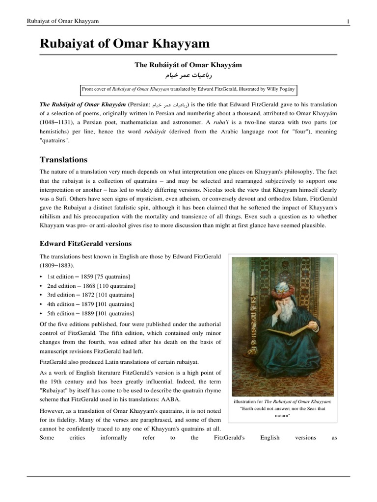 Rubaiyat of Omar Khayyam Persian. By Edward FitzGerald 1809-1883 and. Omar Khayyam10481131 Omar Khayyám 1048 1131 was a Persian polymath.